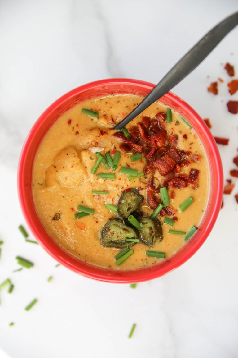 - Trek ten slotte de verkoolde schil van de jalapeños los en gooi deze weg. Houd één jalapeño opzij om later te garneren. Nu bewaar je de zaden of gooi je ze weg door met de achterkant van een mes door het midden van elke jalapeño te gaan. In de zaden vind je de warmte en kruiden, en je weet nooit echt wat je gaat krijgen, dus ik heb de zaden voor 2 jalapeños bewaard en de zaden voor de andere twee weggegooid, maar ik laat de kruiden op niveau staan. dat is jouw keuze. Snijd de jalapeños vervolgens in kleine stukjes en voeg ze toe aan de pot. Voeg de bloemkool, roomkaas en slagroom toe en gebruik een staafmixer om de soep tot een gladde massa te mixen. Roer de aardappelen door de soep en proef of de soep nog zout nodig heeft. Ik ontdekte dat dit het geval was en voegde ongeveer een halve theelepel meer toe!